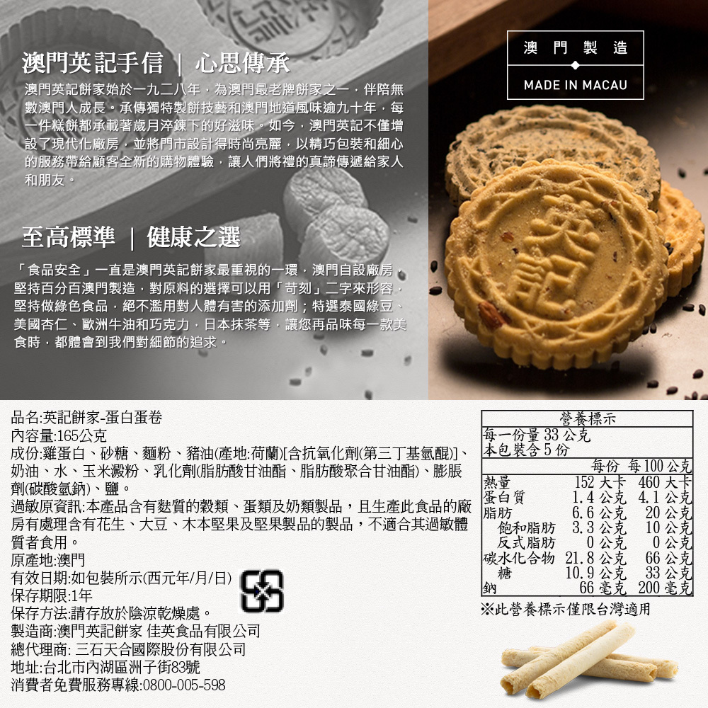 【過敏原資訊】本產品含有麩質的穀類、蛋及牛奶製品,且生產此食品的廠房有處理含有花生、大豆、芝麻、堅果類製品的製品,不適合其過敏體質者食用。