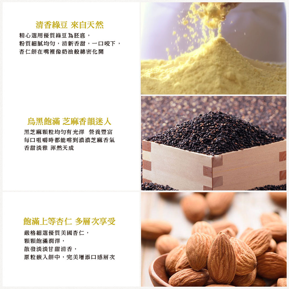 【內容物名稱】混合綠豆粉(含綠豆粉和扁豆)、砂糖、豌豆粉、豬油(產地:荷蘭)、黑芝麻、杏仁、花生、水、花生醬(花生)、鹽、杏仁油、食用黃色四號。